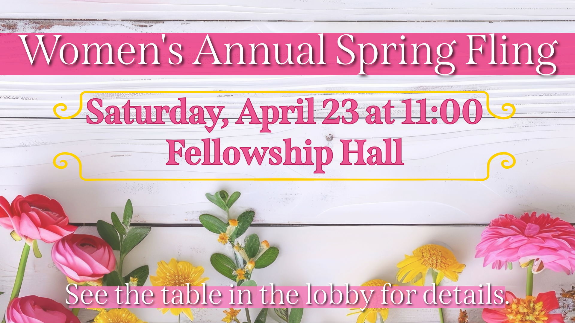 Join us on April 23rd at 11:00 for our Annual Spring Fling. We will enjoy tea/coffee snacks, a purse auction and much more! You can also sign up to decorate a table with prizes for the most popular table! The cost is $15. Childcare is available at no cost but you must register in advance. Please fill out this form and click submit.